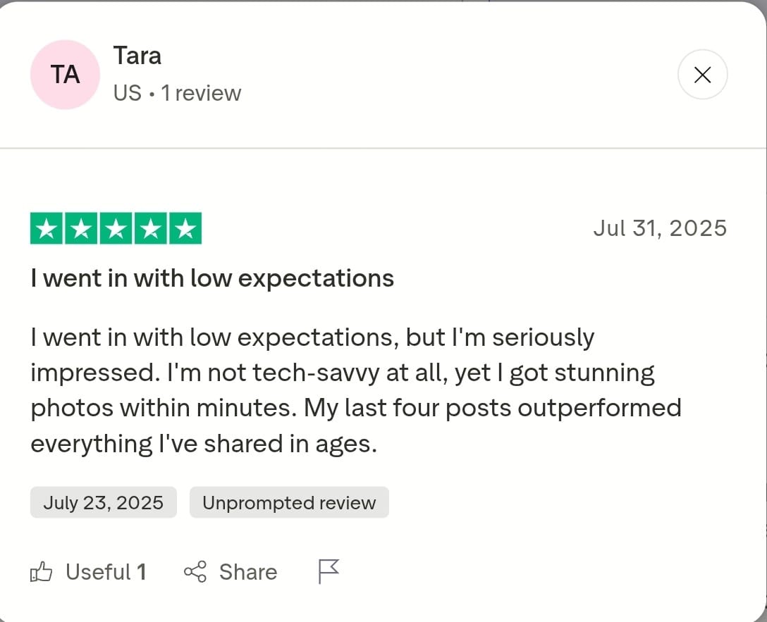 One-Tap Generation means zero knowledge of prompt engineering, lighting theory, or compositional best practices is required to get professional-looking results. Select a preset, tap generate, and you have polished content ready to publish.